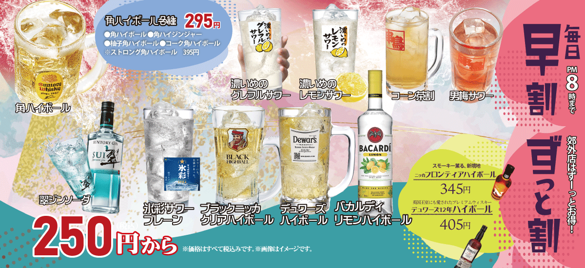 早割 タイムサービス実施中!1杯250円(税込)から