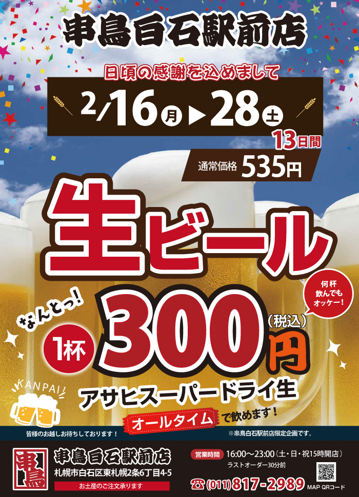 串鳥白石駅前店 生ビール企画 300円!2/16(月)~2/28(土)