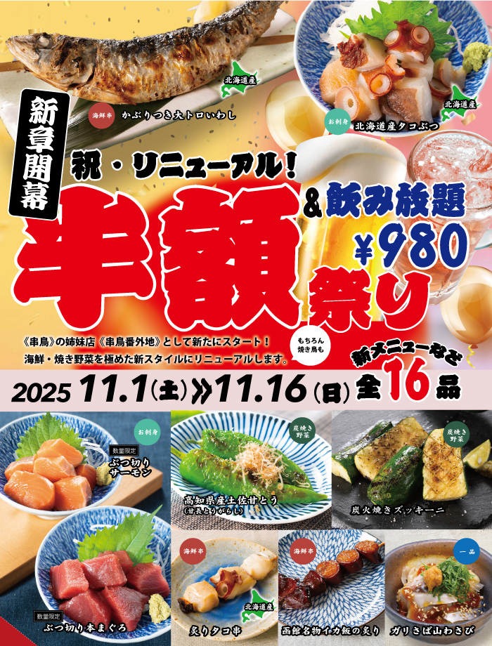 串鳥本町店は2025年11月1日(土)に、串鳥の姉妹店≪串鳥番外地≫として新たにスタートします!